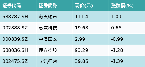 截至收盘,智能音箱主题涨跌幅最高的五只股票为:海天瑞声(688787.SH)、惠威科技(002888.SZ)、中信国安(000839.SZ)、传音控股(688036.SH)与立讯精密(002475.SZ)。详情见下表: