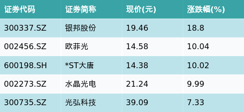 截至午间收盘,小米概念主题涨跌幅最高的五只股票为:银邦股份(300337.SZ)、欧菲光(002456.SZ)、*ST大唐(600198.SH)、水晶光电(002273.SZ)与光弘科技(300735.SZ)。详情见下表: