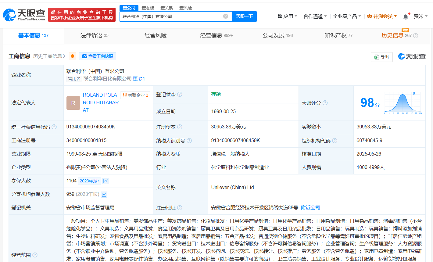 南方财经6月9日电,天眼查App显示,近日,联合利华(中国)有限公司发生工商变更,钟兆民卸任法定代表人、董事长,由ROLANDPOLAROIDHUTABARAT接任。该公司成立于1999年8月,注册资本约3.1亿美元,经营范围包括个人卫生用品销售、美发饰品生产、美发饰品销售、化妆品批发、日用化学产品制造、日用化学产品销售等,由联合利华(中国)投资有限公司全资持股。