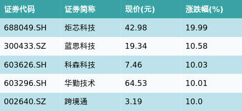 截至早盘收盘,无线耳机主题涨跌幅最高的五只股票为:炬芯科技(688049.SH)、蓝思科技(300433.SZ)、科森科技(603626.SH)、华勤技术(603296.SH)与跨境通(002640.SZ)。详情见下表: