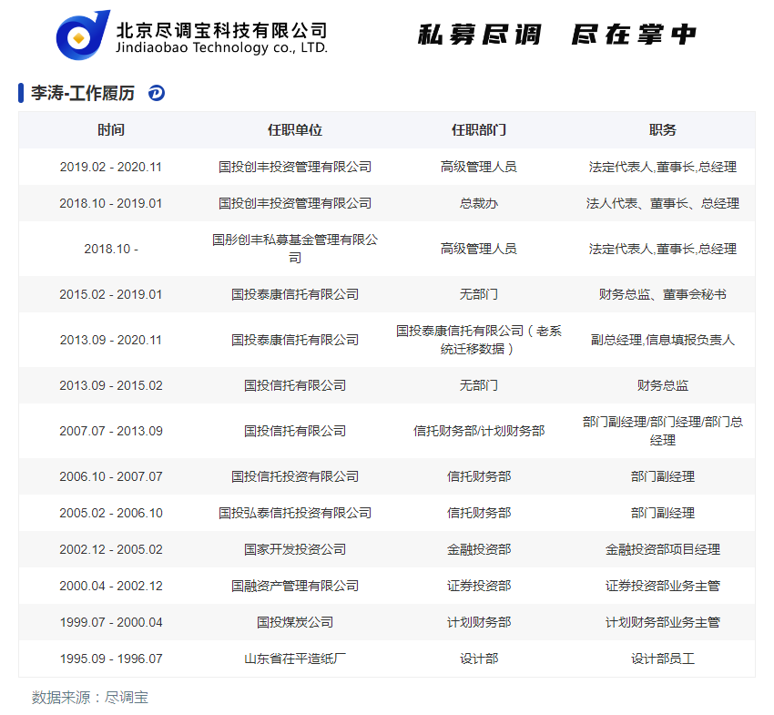 南方财经07月21日电,据尽调宝数据显示,07月21日国彤创丰私募基金管理有限公司发生高管变更,李涛不再担任法定代表人、董事长、总经理并退出高管团队。中基协登记信息显示,国彤创丰私募基金管理有限公司是一家私募股权、创业投资基金管理人,成立于2018年6月6日,,注册资本2.00亿元,其中实缴资本7000.00万元,管理规模产品区间为20-50亿元,实际控制人为国投资本股份有限公司。