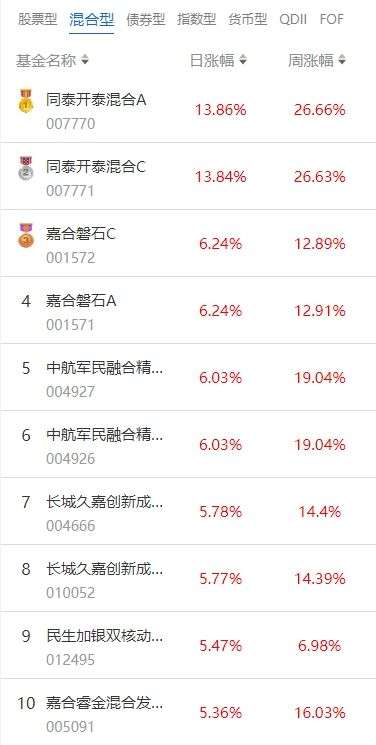 南方财经10月22日电,根据南财基金通数据:2024年10月21日当日收益靠前的混合型基金包括:同泰开泰混合型证券投资基金(007770,日收益13.86%);嘉合磐石混合型证券投资基金(001572,日收益6.24%);中航军民融合精选混合型证券投资基金(004927,日收益6.03%)等。收益较低的股票型基金包括:嘉实港股互联网产业核心资产混合型证券投资基金(011925,日收益-2.36%);汇添富沪港深大盘价值混合型证券投资基金(005504,日收益-1.97%);华安沪港深机会灵活配置混合型证券投资基金(004263,日收益-1.94%)等。