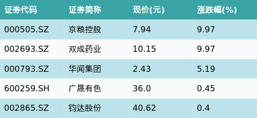 截至收盘,海南主题涨跌幅最高的五只股票为:京粮控股(000505.SZ)、双成药业(002693.SZ)、华闻集团(000793.SZ)、广晟有色(600259.SH)与钧达股份(002865.SZ)。详情见下表: