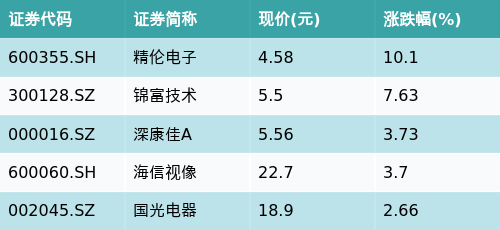 截至收盘,智能电视主题涨跌幅最高的五只股票为:精伦电子(600355.SH)、锦富技术(300128.SZ)、深康佳A(000016.SZ)、海信视像(600060.SH)与国光电器(002045.SZ)。详情见下表: