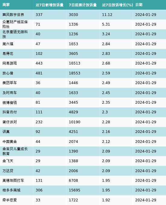 南方财经1月30日电,1月29日黑猫投诉网站数据显示:巽风数字世界、众惠财产相互保险社和北京星链无限科技排在近7日投诉增长率前三名,分别为11.12%、5.31%和3.24%。其中近7日巽风数字世界新增337起,众惠财产相互保险社新增71起,北京星链无限科技新增40起。近7日投诉增长率前20详情见下表: