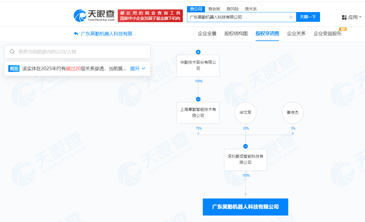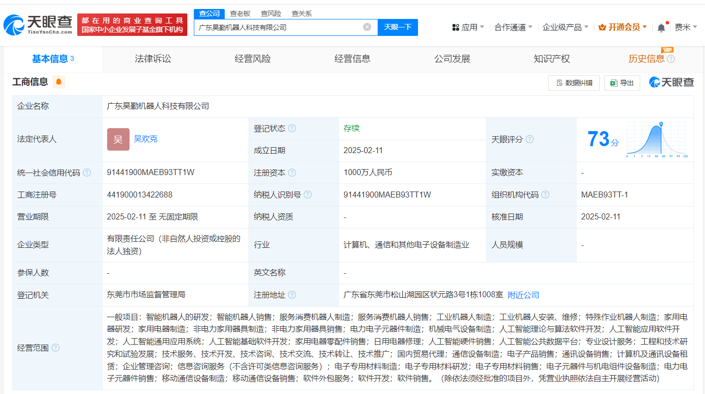 南方财经2月17日电,天眼查App显示,近日,广东昊勤机器人科技有限公司成立,法定代表人为吴欢克,注册资本1000万人民币,经营范围含智能机器人的研发、智能机器人销售、工业机器人制造、人工智能理论与算法软件开发、人工智能应用软件开发、人工智能通用应用系统等。股权全景穿透图显示,该公司由华勤技术(603296)旗下深圳豪成智能科技有限公司全资持股。