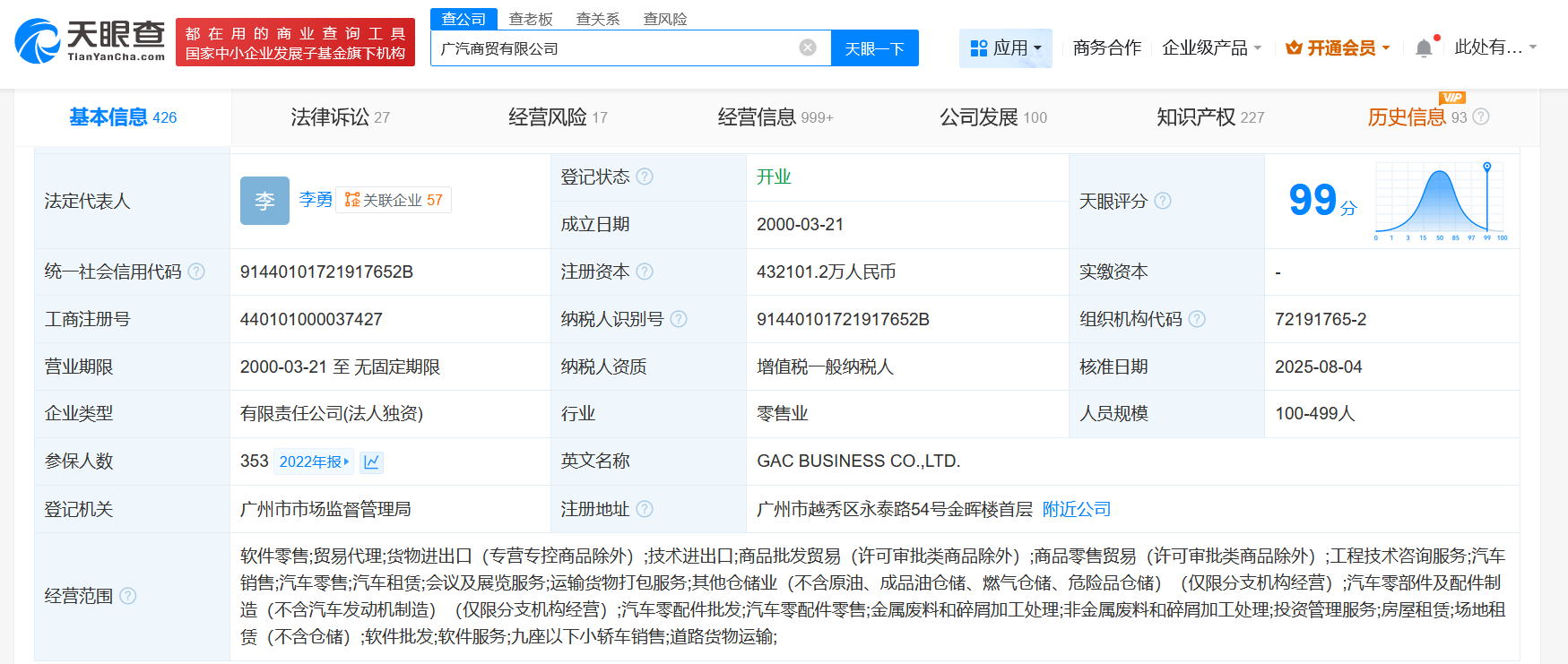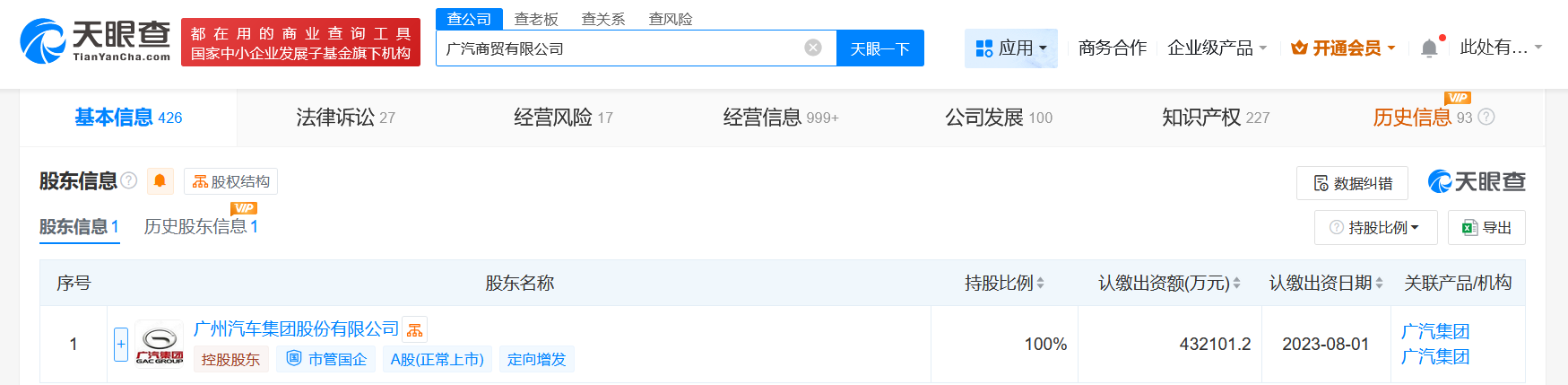 南方财经8月7日电,天眼查App显示,近日,广汽商贸有限公司发生工商变更,注册资本由约39.2亿人民币增至约43.2亿人民币,增幅约10%,同时,闫建明卸任法定代表人,由李勇接任。该公司成立于2000年3月,经营范围含软件零售、贸易代理、货物进出口、技术进出口、工程技术咨询服务、汽车销售、汽车零部件及配件制造、汽车零配件零售、金属废料和碎屑加工处理等。股东信息显示,该公司由广汽集团(601238)全资持股。