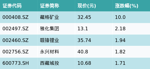 截至午间收盘,锂矿主题涨跌幅最高的五只股票为:藏格矿业(000408.SZ)、雅化集团(002497.SZ)、赣锋锂业(002460.SZ)、永兴材料(002756.SZ)与西藏城投(600773.SH)。详情见下表: