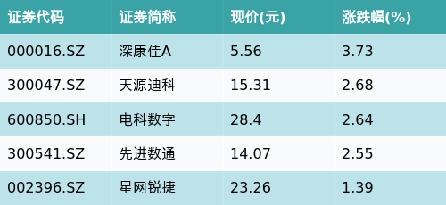 截至收盘,IPV6主题涨跌幅最高的五只股票为:深康佳A(000016.SZ)、天源迪科(300047.SZ)、电科数字(600850.SH)、先进数通(300541.SZ)与星网锐捷(002396.SZ)。详情见下表:
