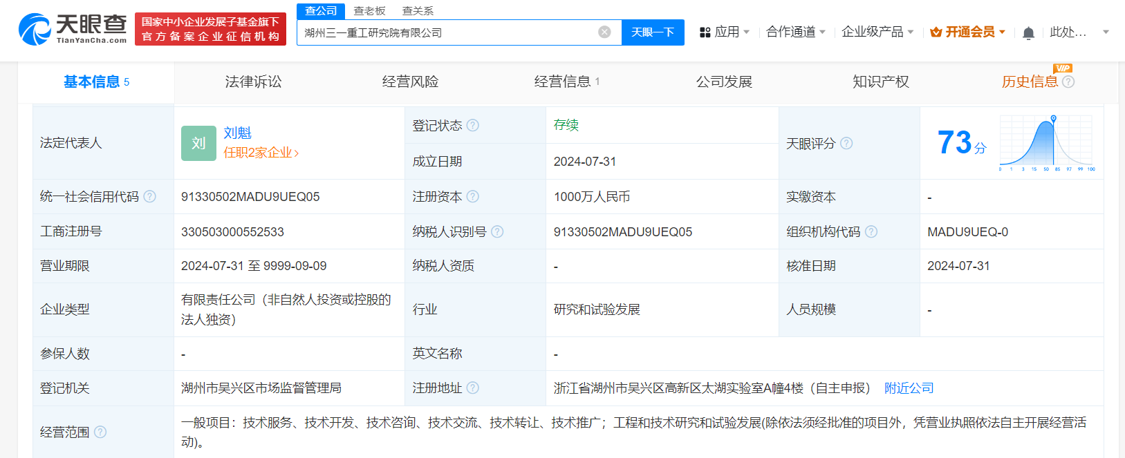 南方财经8月2日电,天眼查App显示,近日,湖州三一重工研究院有限公司成立,法定代表人为刘魁,注册资本1000万人民币,经营范围为技术服务、技术开发、技术咨询、技术交流、技术转让、技术推广,工程和技术研究和试验发展,由三一重工(600031)全资持股。