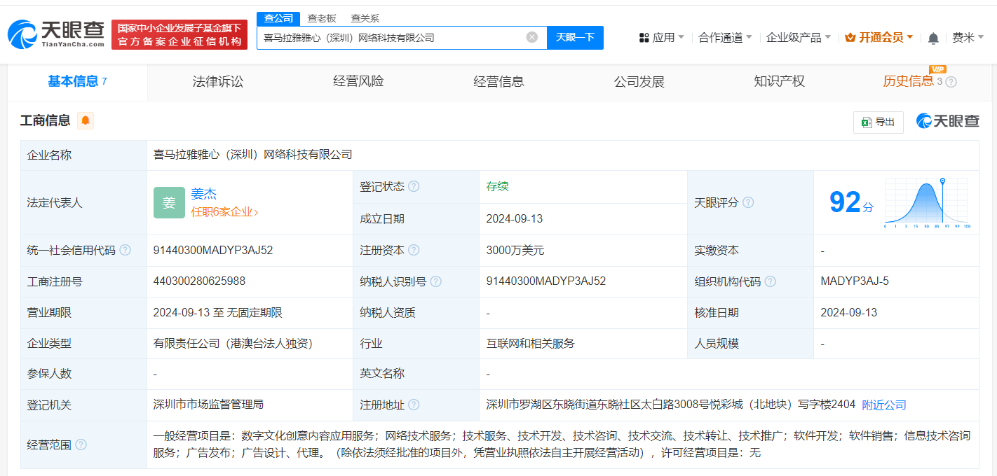 南方财经9月14日电,天眼查App显示,近日,喜马拉雅雅心(深圳)网络科技有限公司成立,法定代表人为姜杰,注册资本3000万美元,经营范围含数字文化创意内容应用服务、网络技术服务、软件销售、信息技术咨询服务、广告发布等。股东信息显示,该公司由Ximalaya(Hong Kong) Limited全资持股。