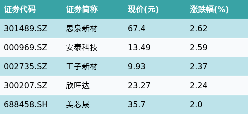 截至收盘,无线充电主题涨跌幅最高的五只股票为:思泉新材(301489.SZ)、安泰科技(000969.SZ)、王子新材(002735.SZ)、欣旺达(300207.SZ)与美芯晟(688458.SH)。详情见下表: