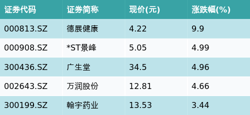 截至收盘,仿制药一致性评价主题涨跌幅最高的五只股票为:德展健康(000813.SZ)、*ST景峰(000908.SZ)、广生堂(300436.SZ)、万润股份(002643.SZ)与翰宇药业(300199.SZ)。详情见下表: