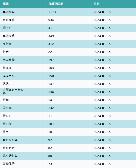 南方财经1月16日电,根据黑猫投诉网站数据显示,1月15日新增投诉回复最高前三名的商家分别为:美团外卖、京东商城和饿了么,分别增加1173起、534起和411起。1月15日新增投诉回复前20详情见下表: