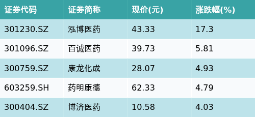截至午间收盘,CRO/CMO主题涨跌幅最高的五只股票为:泓博医药(301230.SZ)、百诚医药(301096.SZ)、康龙化成(300759.SZ)、药明康德(603259.SH)与博济医药(300404.SZ)。详情见下表: