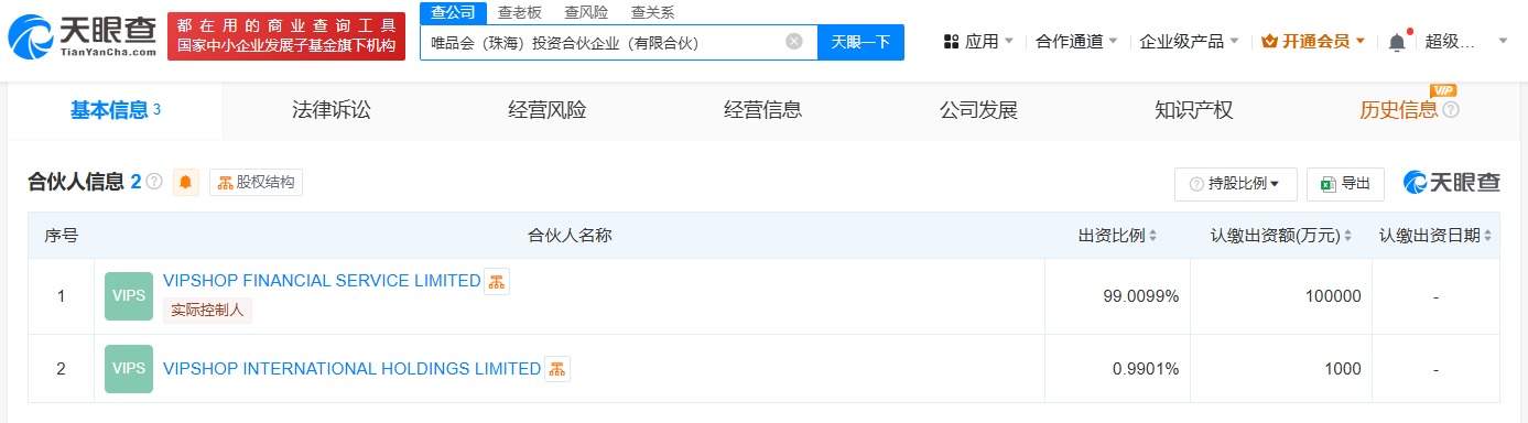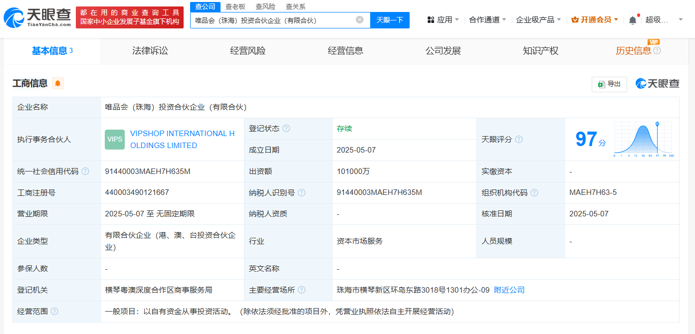 唯品会在珠海成立投资合伙企业 出资额10.1亿