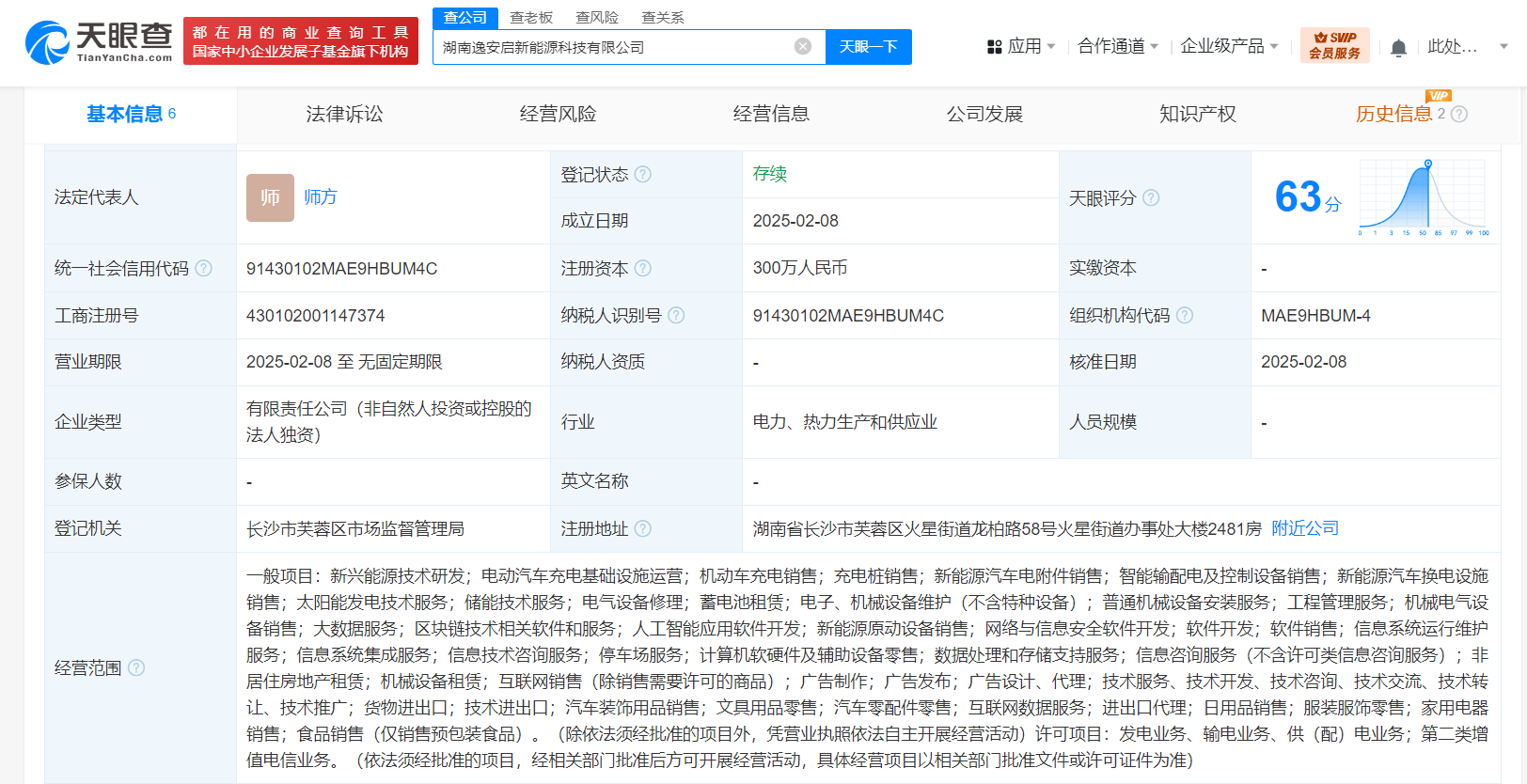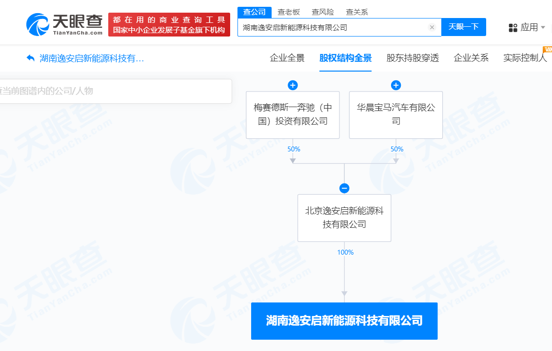 南方财经2月11日电,天眼查App显示,近日,湖南逸安启新能源科技有限公司成立,法定代表人为师方,注册资本300万人民币,经营范围含新兴能源技术研发、充电桩销售、新能源汽车电附件销售、人工智能应用软件开发、网络与信息安全软件开发、信息系统集成服务等。股权全景穿透图显示,该公司由北京逸安启新能源科技有限公司全资持股,后者由梅赛德斯一奔驰(中国)投资有限公司、华晨宝马汽车有限公司各持股50%。