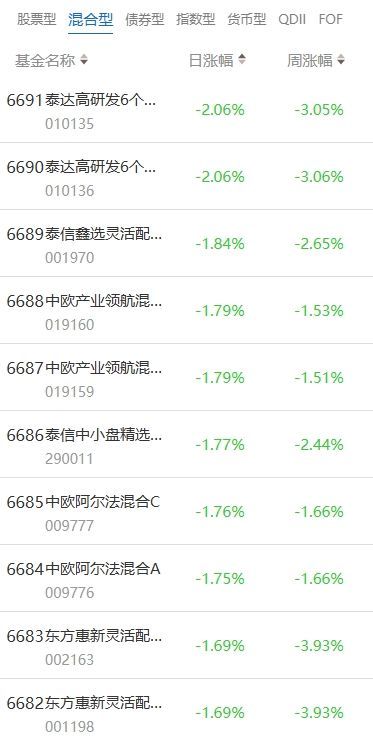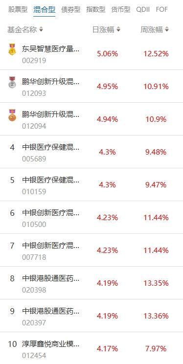 南方财经6月13日电,2025年6月12日当日收益靠前的混合型基金包括:东吴智慧医疗量化策略灵活配置混合型证券投资基金(002919,日收益5.06%);鹏华创新升级混合型证券投资基金(012093,日收益4.95%);中银医疗保健灵活配置混合型证券投资基金(005689,日收益4.3%)等。收益较低的混合型基金包括:宏利高研发创新6个月持有期混合型证券投资基金(010135,日收益-2.06%);泰信鑫选灵活配置混合型证券投资基金(001970,日收益-1.84%);中欧产业领航混合型证券投资基金(019160,日收益-1.79%)等。
