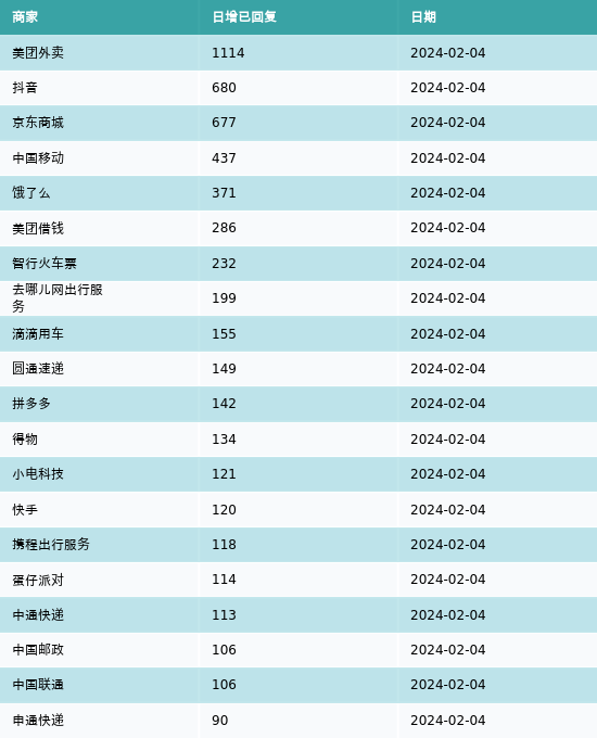 南方财经2月5日电,根据黑猫投诉网站数据显示,2月4日新增投诉回复最高前三名的商家分别为:美团外卖、抖音和京东商城,分别增加1114起、680起和677起。2月4日新增投诉回复前20详情见下表: