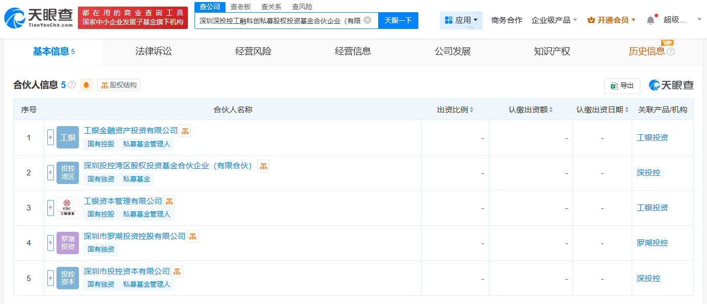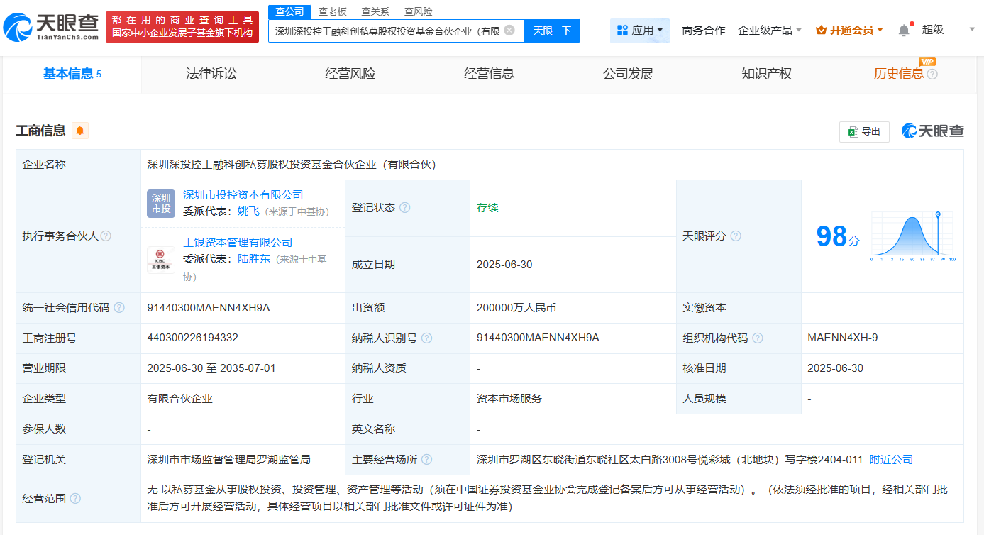 南方财经7月1日电,天眼查App显示,近日,深圳深投控工融科创私募股权投资基金合伙企业(有限合伙)成立,执行事务合伙人为深圳市投控资本有限公司、工银资本管理有限公司,出资额20亿人民币,经营范围包括以私募基金从事股权投资、投资管理、资产管理等活动。合伙人信息显示,该基金由工银金融资产投资有限公司、深圳投控湾区股权投资基金合伙企业(有限合伙)、深圳市罗湖投资控股有限公司等共同出资。
