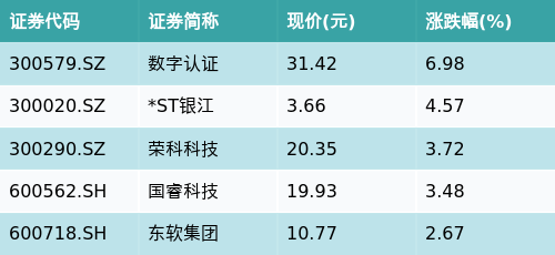 截至收盘,国产软件主题涨跌幅最高的五只股票为:数字认证(300579.SZ)、*ST银江(300020.SZ)、荣科科技(300290.SZ)、国睿科技(600562.SH)与东软集团(600718.SH)。详情见下表: