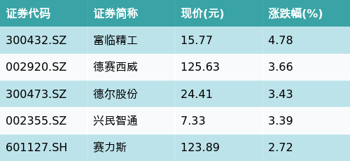截至收盘,华为汽车主题涨跌幅最高的五只股票为:富临精工(300432.SZ)、德赛西威(002920.SZ)、德尔股份(300473.SZ)、兴民智通(002355.SZ)与赛力斯(601127.SH)。详情见下表: