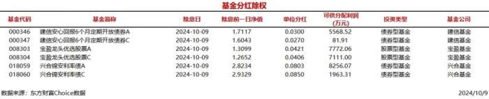 南方财经10月9日电,据东方财富Choice数据统计,今日共有6只基金分红除权(A/C类分开计算),包括4只债券型基金、2只股票型基金,累计可供分配利润3.08亿元。
