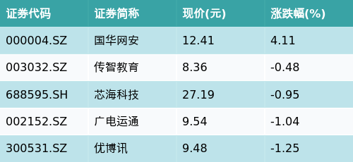 截至收盘,华为鸿蒙主题涨跌幅最高的五只股票为:国华网安(000004.SZ)、传智教育(003032.SZ)、芯海科技(688595.SH)、广电运通(002152.SZ)与优博讯(300531.SZ)。详情见下表: