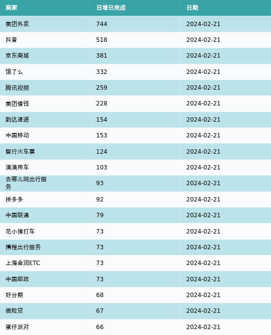 南方财经2月22日电,根据黑猫投诉网站数据显示,2月21日新增投诉完成处理最高前三名的商家分别为:美团外卖、抖音和京东商城,分别增加744起、518起和381起。2月21日新增投诉完成处理前20详情见下表: