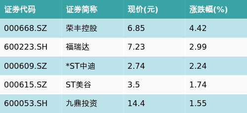 截至收盘,房地产开发主题涨跌幅最高的五只股票为:荣丰控股(000668.SZ)、福瑞达(600223.SH)、*ST中迪(000609.SZ)、ST美谷(000615.SZ)与九鼎投资(600053.SH)。详情见下表: