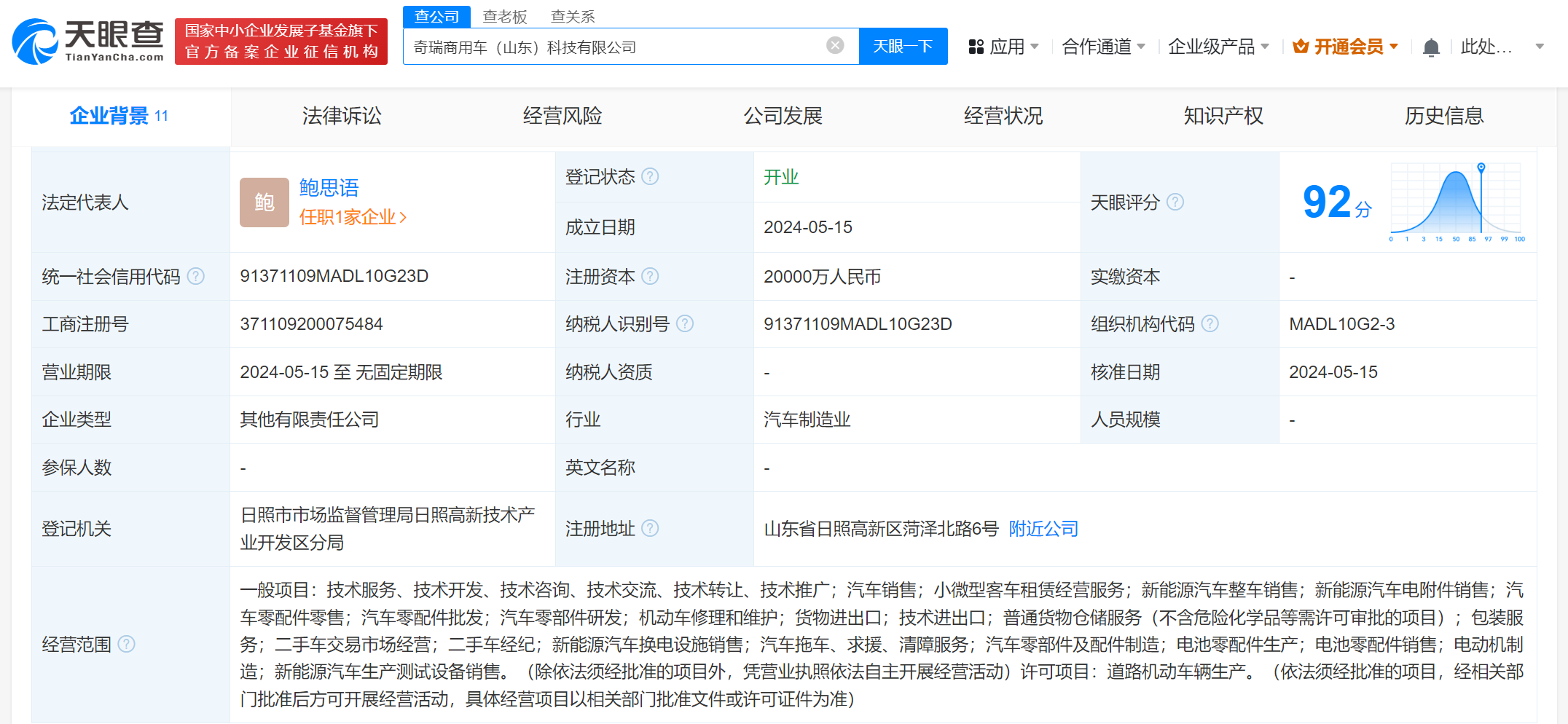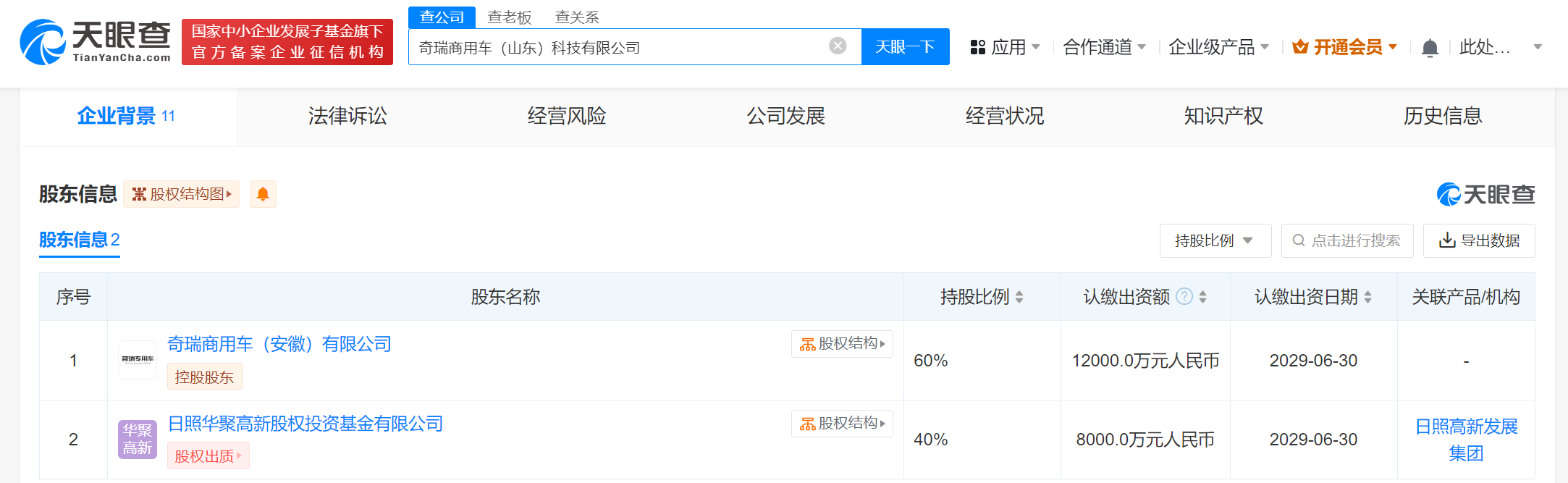 奇瑞商用车在山东成立科技公司 注册资本2亿