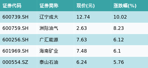 截至收盘,石油主题涨跌幅最高的五只股票为:辽宁成大(600739.SH)、洲际油气(600759.SH)、广汇能源(600256.SH)、海南矿业(601969.SH)与泰山石油(000554.SZ)。详情见下表: