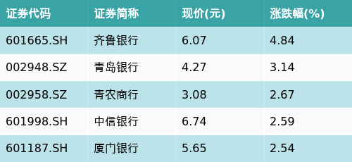截至午间收盘,银行主题涨跌幅最高的五只股票为:齐鲁银行(601665.SH)、青岛银行(002948.SZ)、青农商行(002958.SZ)、中信银行(601998.SH)与厦门银行(601187.SH)。详情见下表: