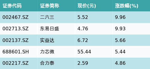 截至收盘,小米概念主题涨跌幅最高的五只股票为:二六三(002467.SZ)、东易日盛(002713.SZ)、实益达(002137.SZ)、力芯微(688601.SH)与合力泰(002217.SZ)。详情见下表: