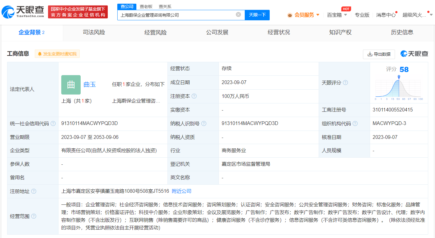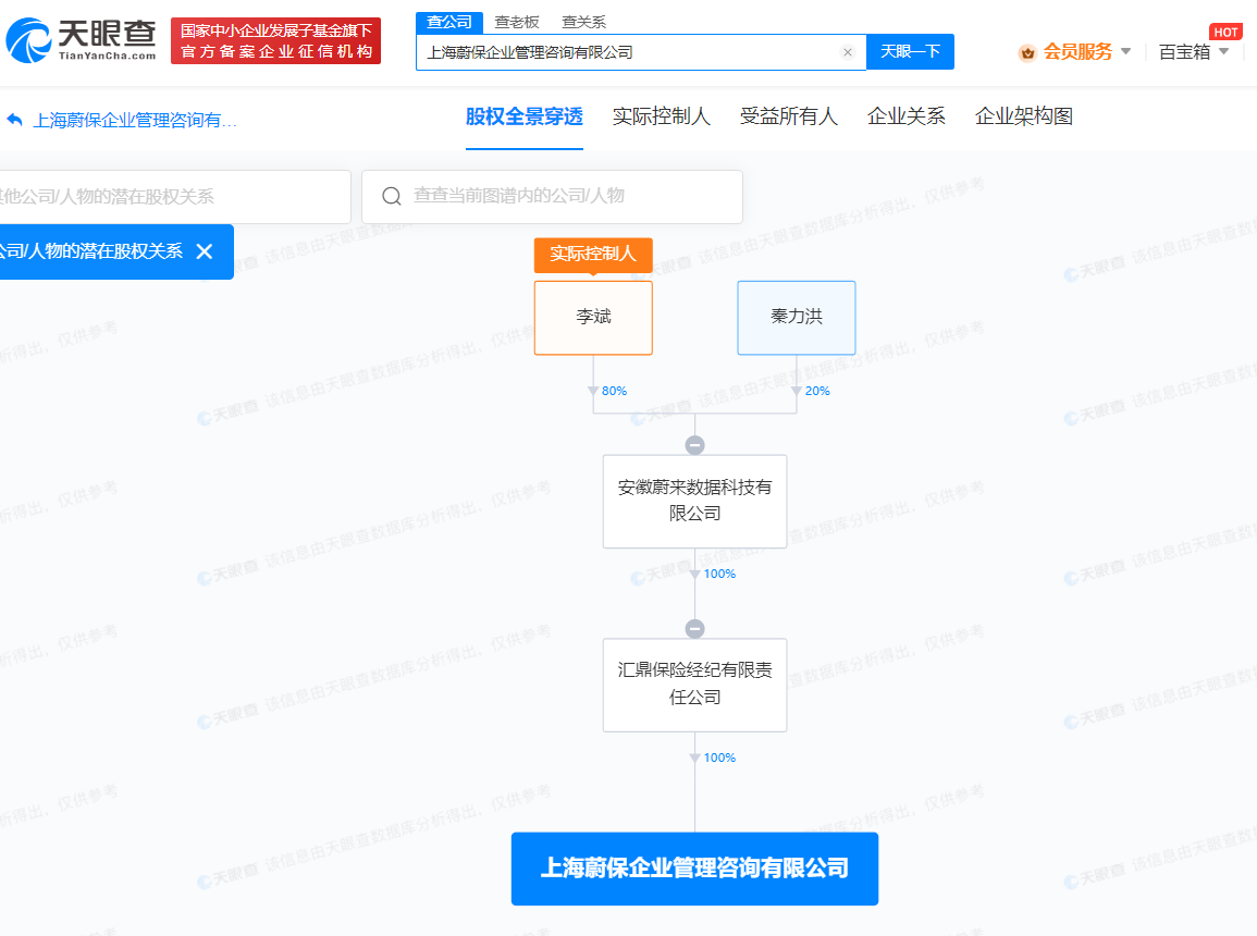南方财经9月12日电,天眼查App显示,近日,上海蔚保企业管理咨询有限公司成立,法定代表人为曲玉,注册资本100万人民币,经营范围包括企业管理咨询、社会经济咨询服务、咨询策划服务、数字内容制作服务、信息咨询服务等。股权全景穿透图显示,该公司由汇鼎保险经纪有限责任公司全资持股,后者为李斌、秦力洪共同持股的安徽蔚来数据科技有限公司全资子公司。
