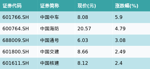 截至午间收盘,中字头主题涨跌幅最高的五只股票为:中国中车(601766.SH)、中国海防(600764.SH)、中国通号(688009.SH)、中国交建(601800.SH)与中国核建(601611.SH)。详情见下表: