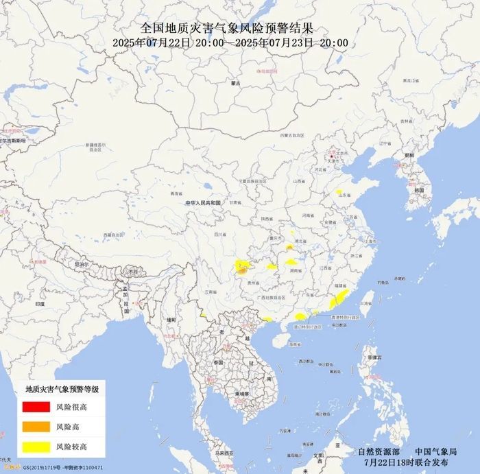 2025年7月22日20时至23日20时,福建东南局部、山东中部局部、湖北中部局部和南部、湖南中部局部和北部局部、广东南部局部和东部局部、广西南部局部、重庆东南局部、四川东南局部、贵州东北局部和西北部、云南东北部和西南局部发生地质灾害的风险较高(黄色预警);湖北南部局部、贵州西北局部、云南东北局部发生地质灾害的风险高(橙色预警)。