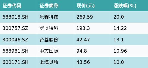 截至午间收盘,集成电路主题涨跌幅最高的五只股票为:乐鑫科技(688018.SH)、罗博特科(300757.SZ)、台基股份(300046.SZ)、中芯国际(688981.SH)与上海贝岭(600171.SH)。详情见下表: