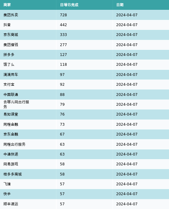 南方财经4月8日电,根据黑猫投诉网站数据显示,4月7日新增投诉完成处理最高前三名的商家分别为:美团外卖、抖音和京东商城,分别增加728起、442起和333起。4月7日新增投诉完成处理前20详情见下表: