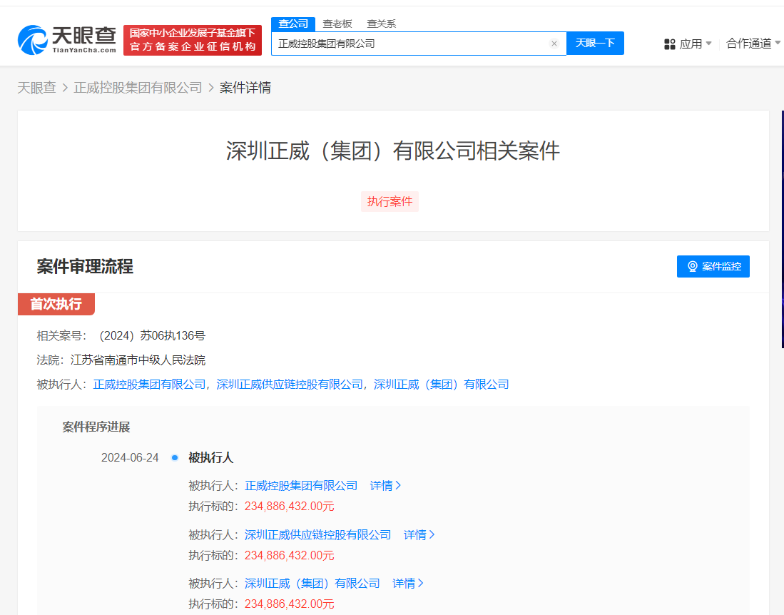 正威集团等被强制执行2.34亿