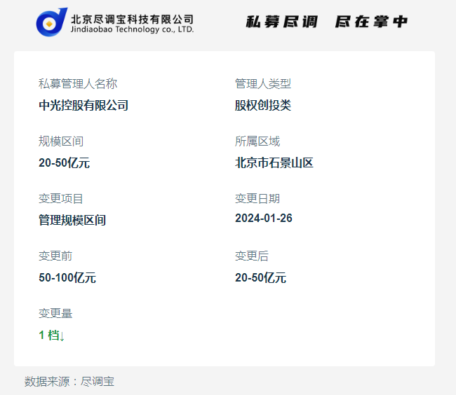 南方财经1月26日电,据尽调宝数据显示,1月26日中光控股有限公司管理规模区间发生调整,由原先的50-100亿元下调为20-50亿元。规模下降的原因可能是:由于管理人进行了季度更新,业绩下降。中基协登记信息显示,中光控股有限公司是一家私募股权、创业投资基金管理人,成立于2016年07月15日,注册资本1.00亿元,其中实缴资本3200.00万元,管理规模产品区间为20-50亿元,实际控制人为中国光大集团股份公司。