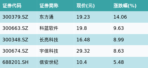 截至收盘,跨境支付(CIPS)主题涨跌幅最高的五只股票为:东方通(300379.SZ)、科蓝软件(300663.SZ)、长亮科技(300348.SZ)、宇信科技(300674.SZ)与信安世纪(688201.SH)。详情见下表: