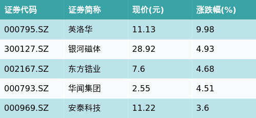 截至午间收盘,稀土永磁主题涨跌幅最高的五只股票为:英洛华(000795.SZ)、银河磁体(300127.SZ)、东方锆业(002167.SZ)、华闻集团(000793.SZ)与安泰科技(000969.SZ)。详情见下表: