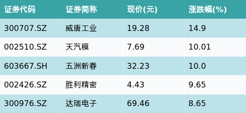 截至午间收盘,特斯拉概念主题涨跌幅最高的五只股票为:威唐工业(300707.SZ)、天汽模(002510.SZ)、五洲新春(603667.SH)、胜利精密(002426.SZ)与达瑞电子(300976.SZ)。详情见下表:
