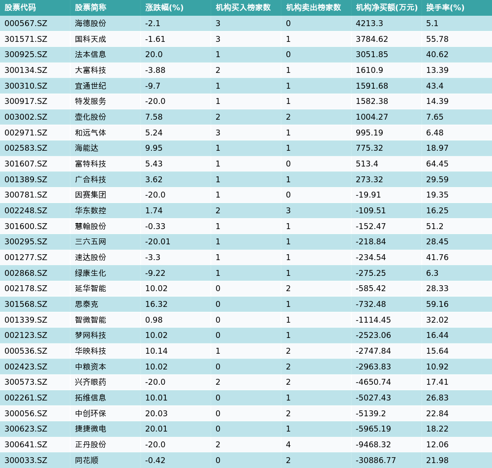 南方财经10月9日电,南财金融终端数据显示,因当日异动登上龙虎榜的个股中,29只沪深A股龙虎榜出现了机构的身影,机构合计净卖出53419.02万元,具体来看,机构净买入11只个股,净卖出18只个股。其中,机构净买入前三分别为海德股份(000567.SZ)、国科天成(301571.SZ)与法本信息(300925.SZ),详情见下图: