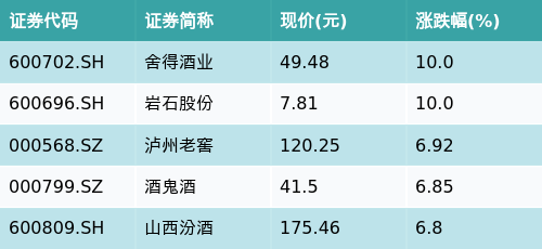 截至午间收盘,白酒概念主题涨跌幅最高的五只股票为:舍得酒业(600702.SH)、岩石股份(600696.SH)、泸州老窖(000568.SZ)、酒鬼酒(000799.SZ)与山西汾酒(600809.SH)。详情见下表: