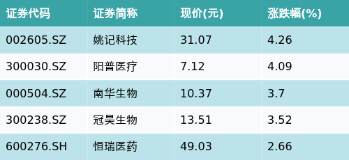 截至午间收盘,细胞免疫治疗主题涨跌幅最高的五只股票为:姚记科技(002605.SZ)、阳普医疗(300030.SZ)、南华生物(000504.SZ)、冠昊生物(300238.SZ)与恒瑞医药(600276.SH)。详情见下表: