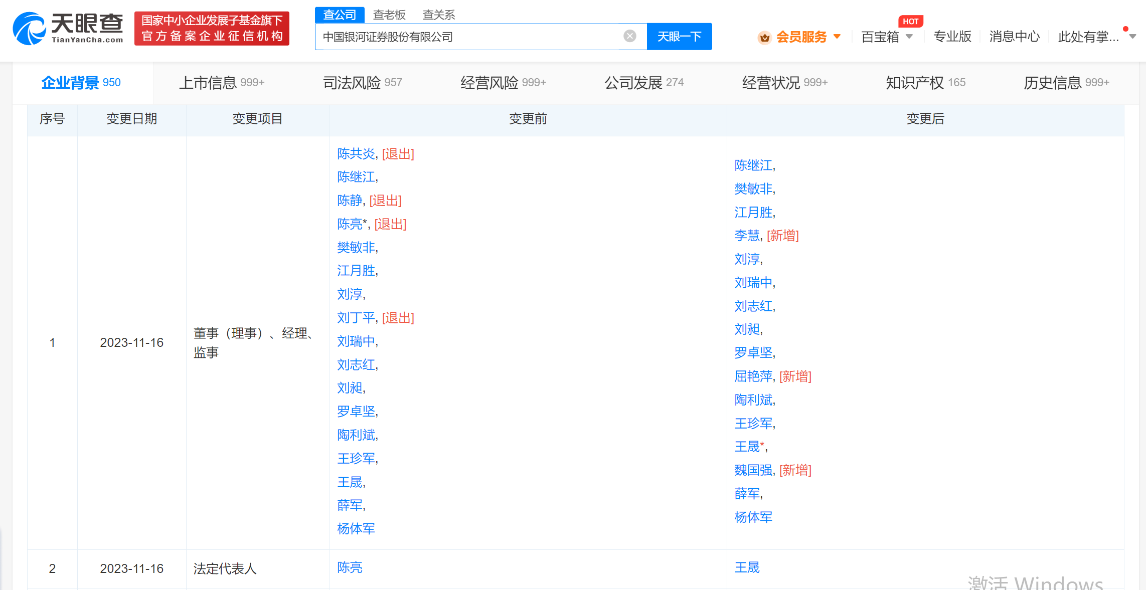 南方财经11月21日电,天眼查App显示,近日,中国银河(601881)发生工商变更,陈亮卸任法定代表人、董事长,由王晟接任,同时,公司多位主要人员也发生变更。中国银河证券股份有限公司成立于2007年1月,注册资本约101亿人民币,经营范围含证券业务、公募证券投资基金销售、保险兼业代理业务、证券公司为期货公司提供中间介绍业务、证券投资基金托管等,由中国银河金融控股有限责任公司、香港中央结算(代理人)有限公司、中国证券金融股份有限公司等共同持股。此前,中国银河曾发布公告称,陈亮因工作安排,提出辞去公司董事及董事长等职务。不久后中国银河再发公告称,董事会同意王晟担任公司董事长。