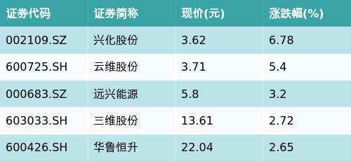 截至收盘,煤化工主题涨跌幅最高的五只股票为:兴化股份(002109.SZ)、云维股份(600725.SH)、远兴能源(000683.SZ)、三维股份(603033.SH)与华鲁恒升(600426.SH)。详情见下表: