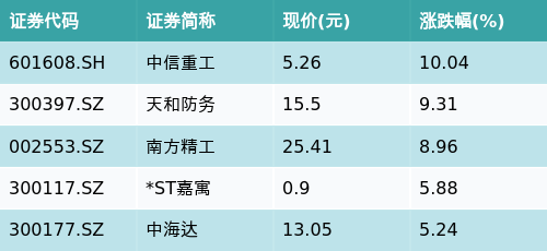 截至早盘收盘,机器人概念主题涨跌幅最高的五只股票为:中信重工(601608.SH)、天和防务(300397.SZ)、南方精工(002553.SZ)、*ST嘉寓(300117.SZ)与中海达(300177.SZ)。详情见下表:
